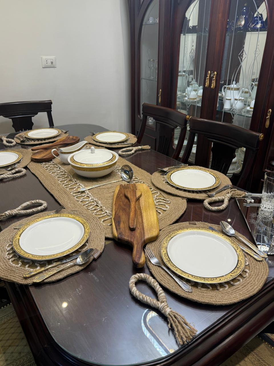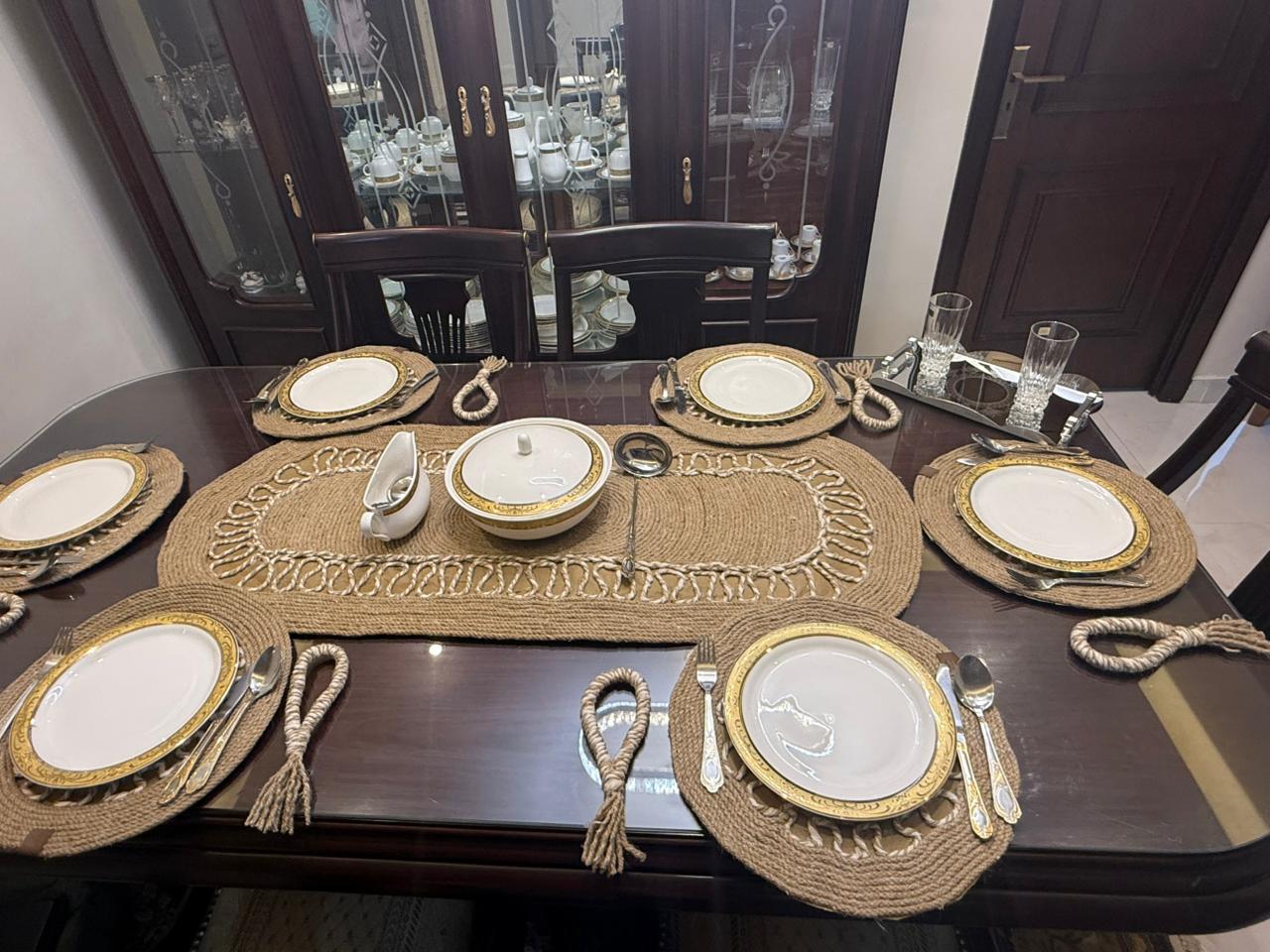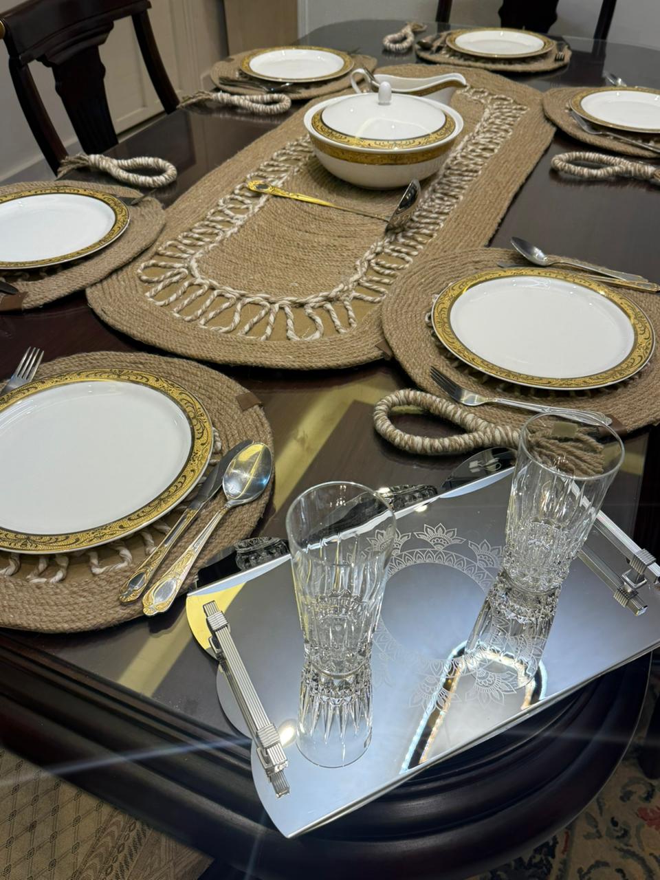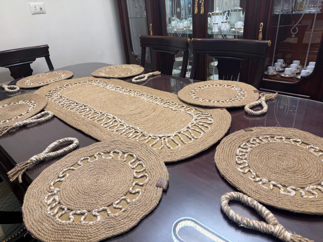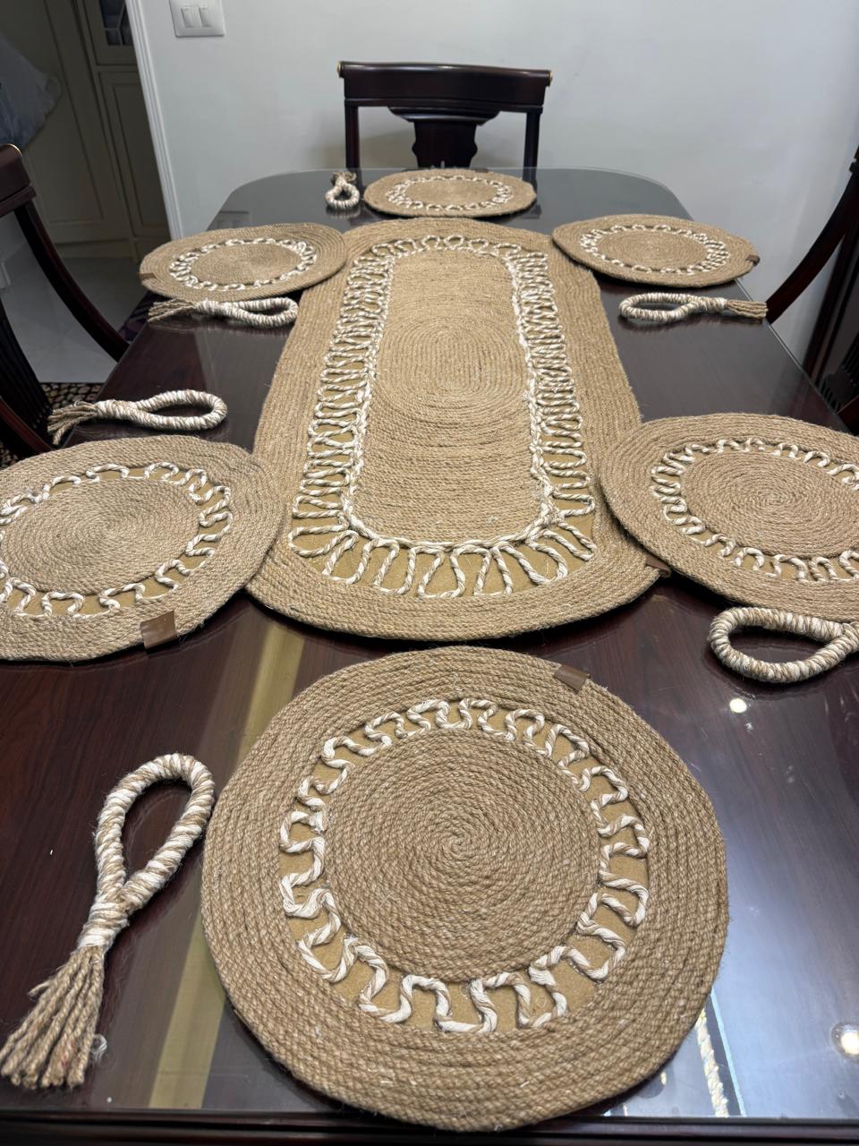 • consisting of an oval tablecloth 112 cm long, 6 coasters with a diameter of 35cm, and 6 napkin holders.