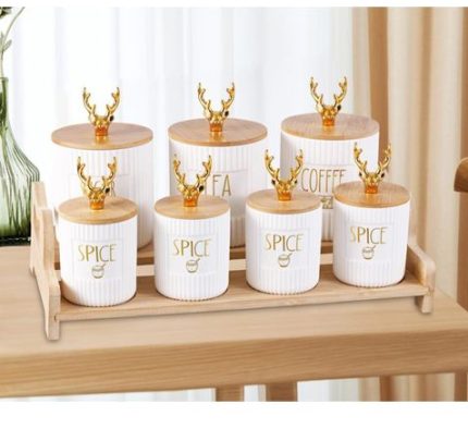 material : porcelain Spice set Ghazala colour: White with golden knop - 7 pieces + wodden holder